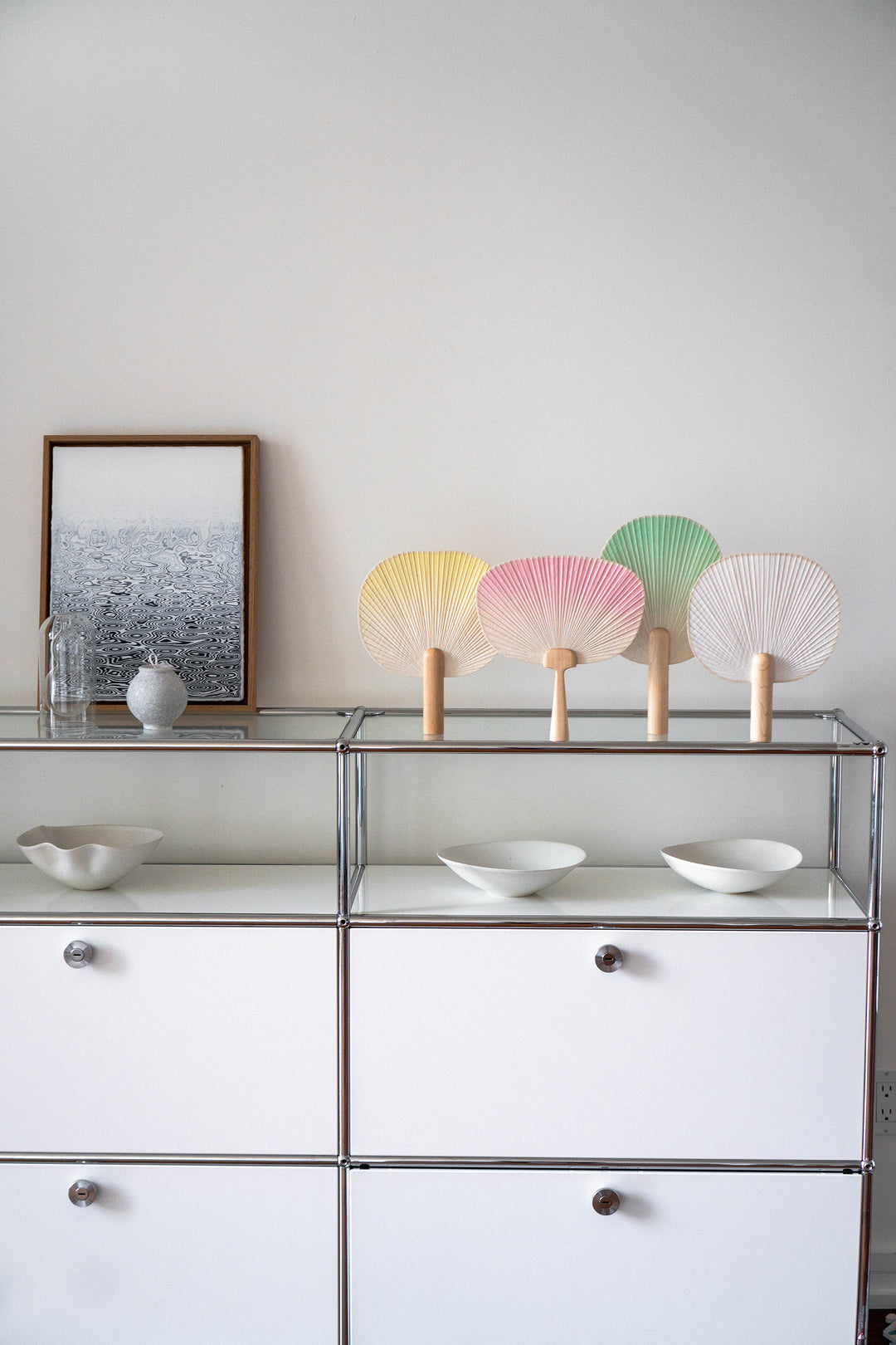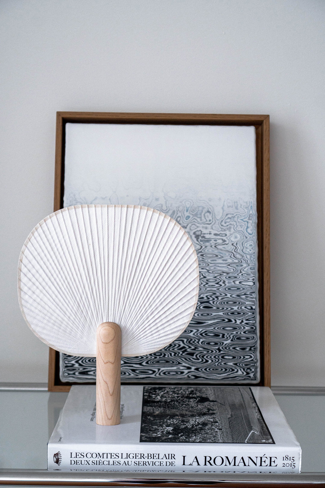 The Frost Breeze collection symbolizes the four seasons through the form of a fan, each resembling a tree in nature’s cycle. The pink fan evokes spring with blossoming cherry trees; the green fan reflects the lush vibrancy of summer; the yellow fan recalls the golden ginkgo leaves of autumn; and the white fan suggests the quiet stillness of winter snow. To create these works, the artist dyes hanji—traditional Korean paper celebrated for its distinctive texture and durability, made from the fibers of mulberry trees. Used for centuries in Korea, hanji embodies both resilience and beauty. These free-standing fans function not only as hand fans to shield from the sun, but also as sculptural objects that enrich the home as decorative art.