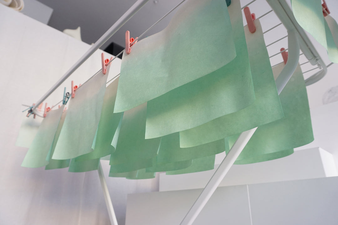 Hanji, the traditional paper that is made out of the fiber of the Korean mulberry trees, was produced by the artisan in Jeonju, South Korea and hand dyed by the artist.