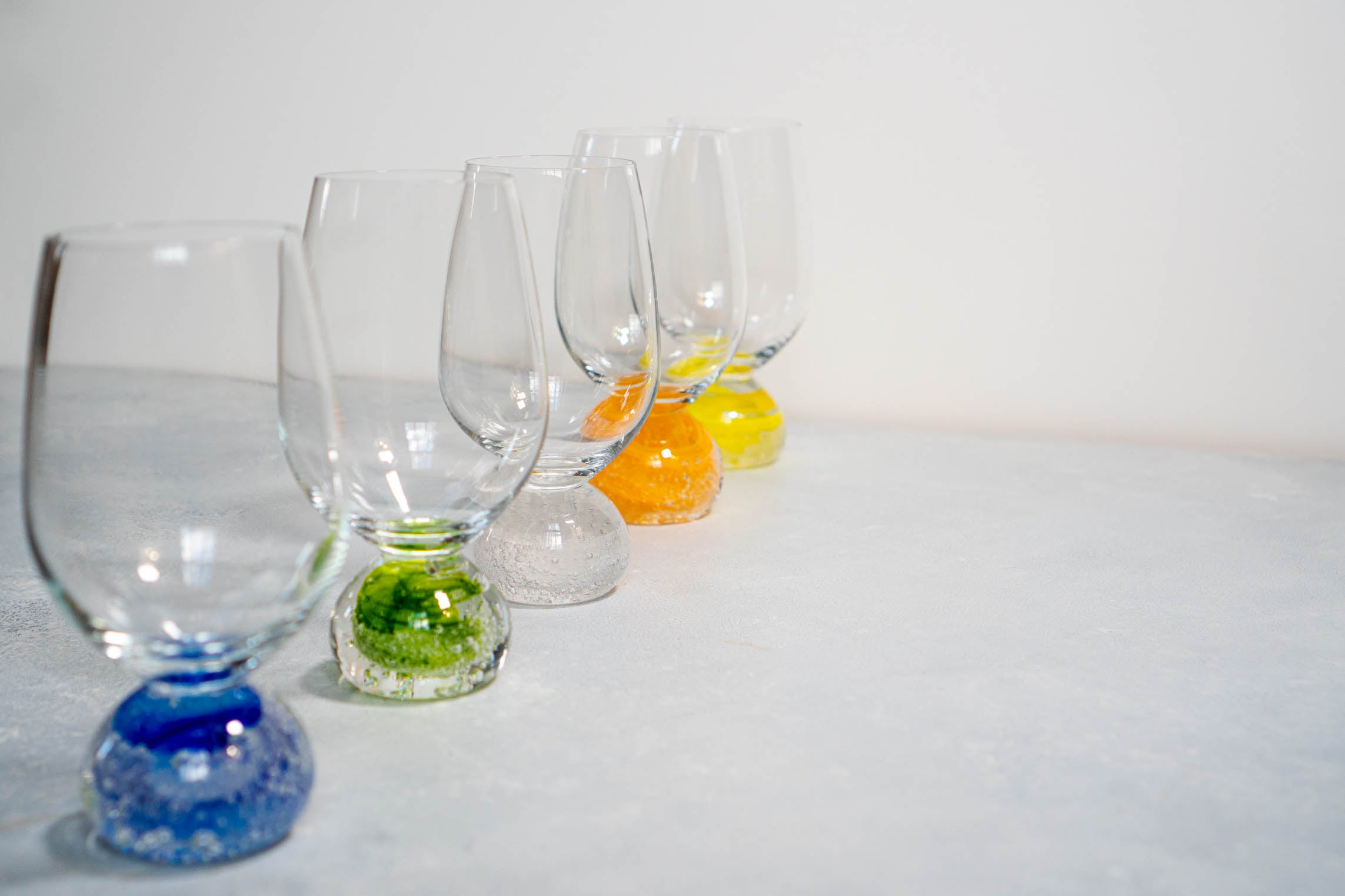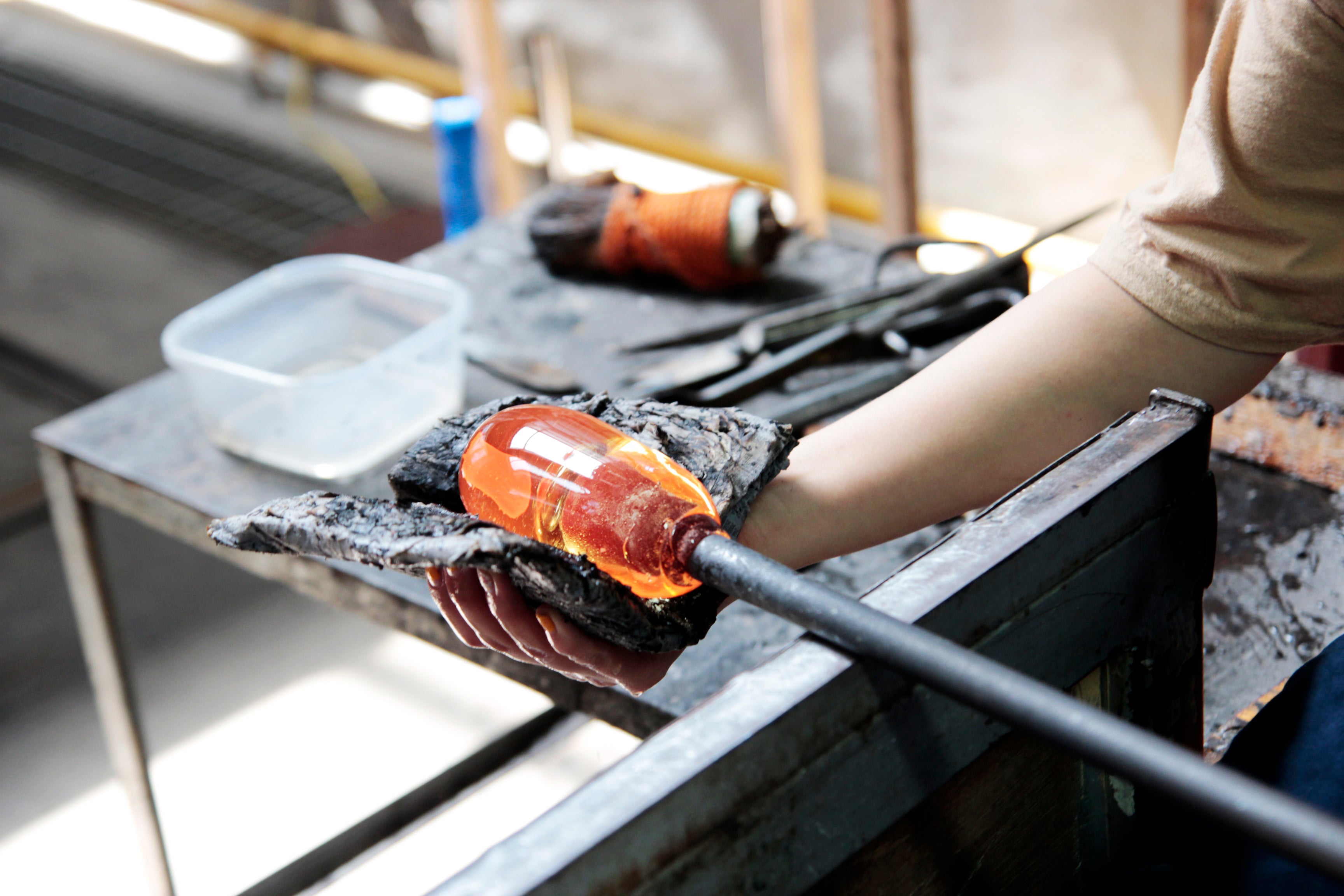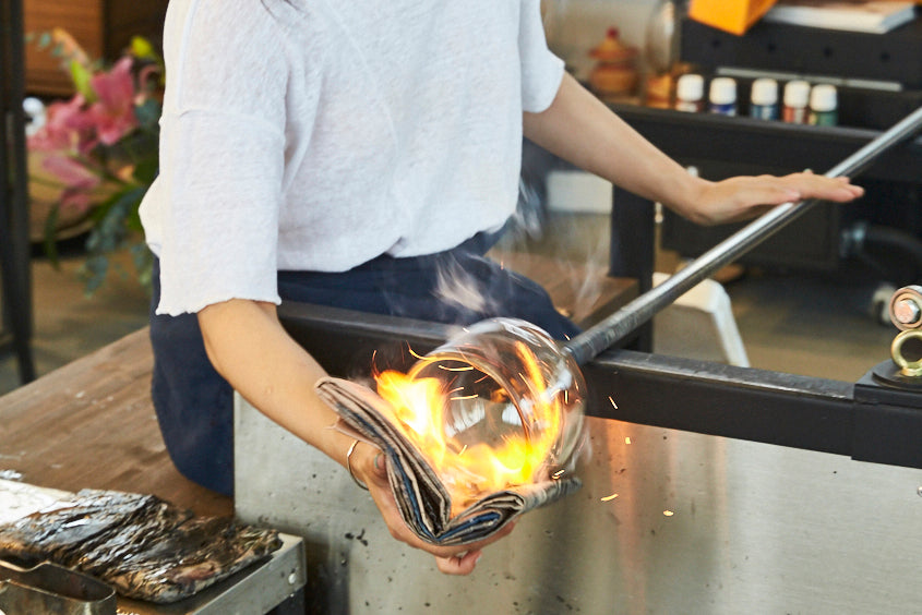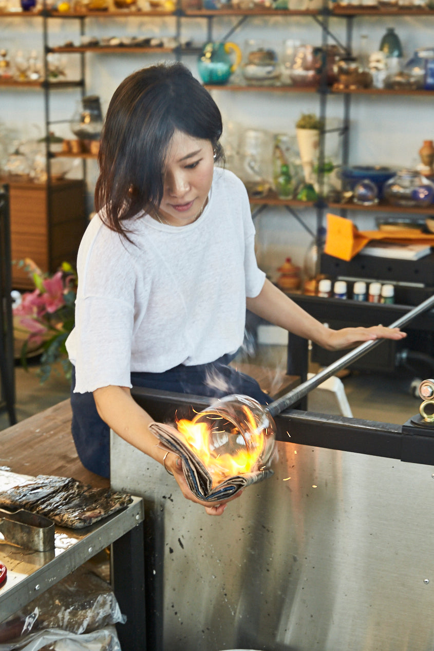 her works are mouth blown and hand crafted at 1250C temperature. She tries to mix and match traditional and modern styles, opaque and transparent glasses, and the beauty of West and East to create her own unique style.