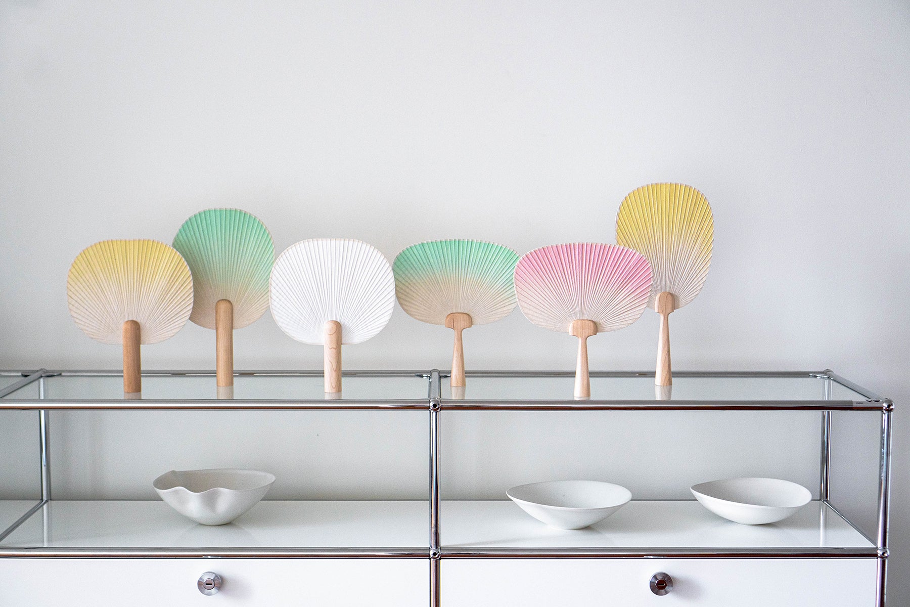 The Frost Breeze collection symbolizes the four seasons through the form of a fan, each resembling a tree in nature’s cycle. The pink fan evokes spring with blossoming cherry trees; the green fan reflects the lush vibrancy of summer; the yellow fan recalls the golden ginkgo leaves of autumn; and the white fan suggests the quiet stillness of winter snow. To create these works, the artist dyes hanji—traditional Korean paper celebrated for its distinctive texture and durability, made from the fibers of mulberry trees. Used for centuries in Korea, hanji embodies both resilience and beauty. These free-standing fans function not only as hand fans to shield from the sun, but also as sculptural objects that enrich the home as decorative art.