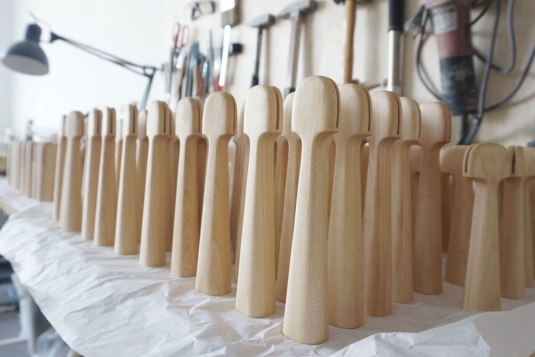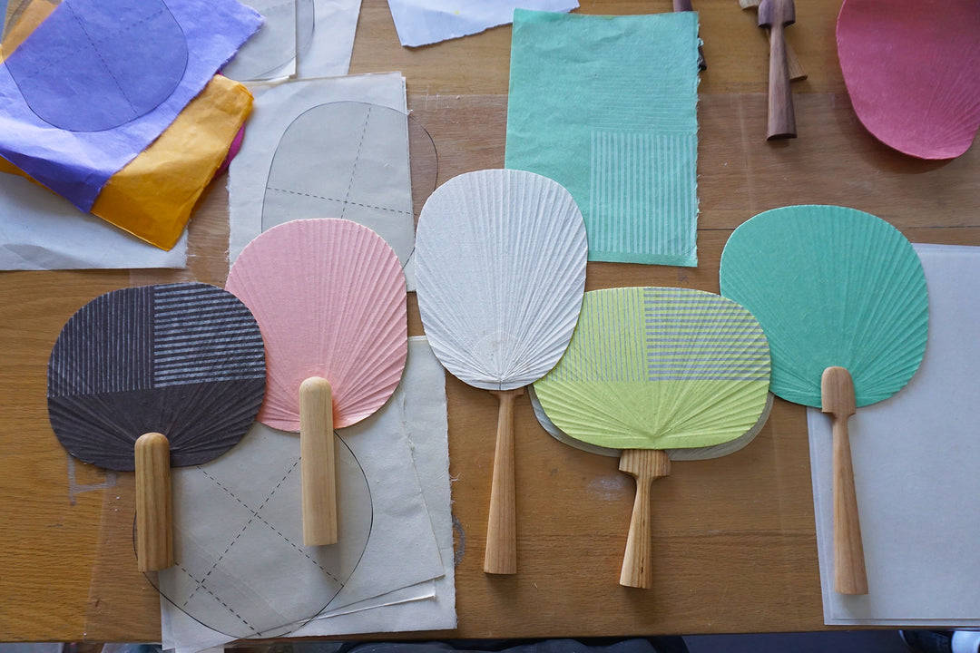 The artist uses two different woods. The maple wood for the handle and bamboos for the framework of the fan layered with hanji